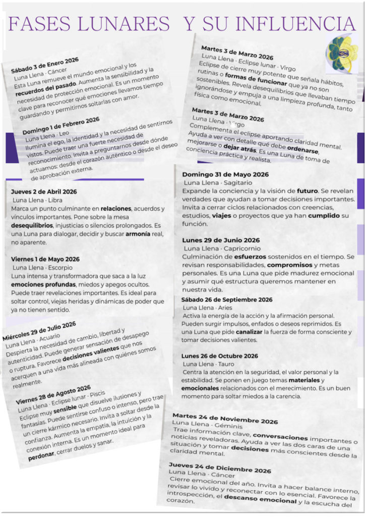 - Luna Llena + Eclipse Total (3 de marzo): «Luna de sangre». Momento máximo para rituales de liberación, cerrar ciclos del invierno y limpiar energías negativas. Intensifica las emociones y la intuición.