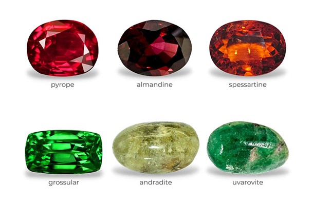 Según su composición química, el granate se divide en dos grandes variedades: la serie del aluminio (que incluye el piropo, el almandino y la espesartina) y la serie del calcio (que incluye la grosularita, el granate andradita y la uvarovita).