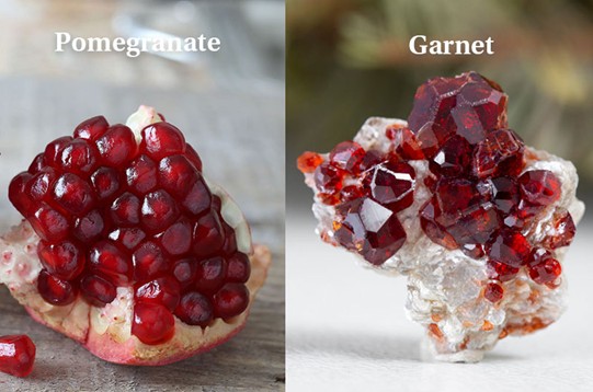 En la antigüedad, el granate se llamaba carbunclo, que significa gema roja y se considera un regalo de Dios al rey Salomón. Posteriormente recibió el nombre de Granate, que deriva del latín Granatum, ya que se asemeja a las “semillas” de la granada en color y forma.