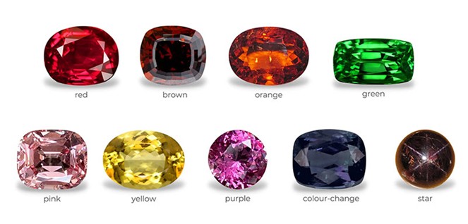 Espesartina: El granate espesartina es de color naranja a rojo anaranjado y puede tener tonos marrones, morados o amarillos. Además, una mezcla de piropo y granate espesartita es un granate que cambia de color. Es raro y valorado por los coleccionistas.